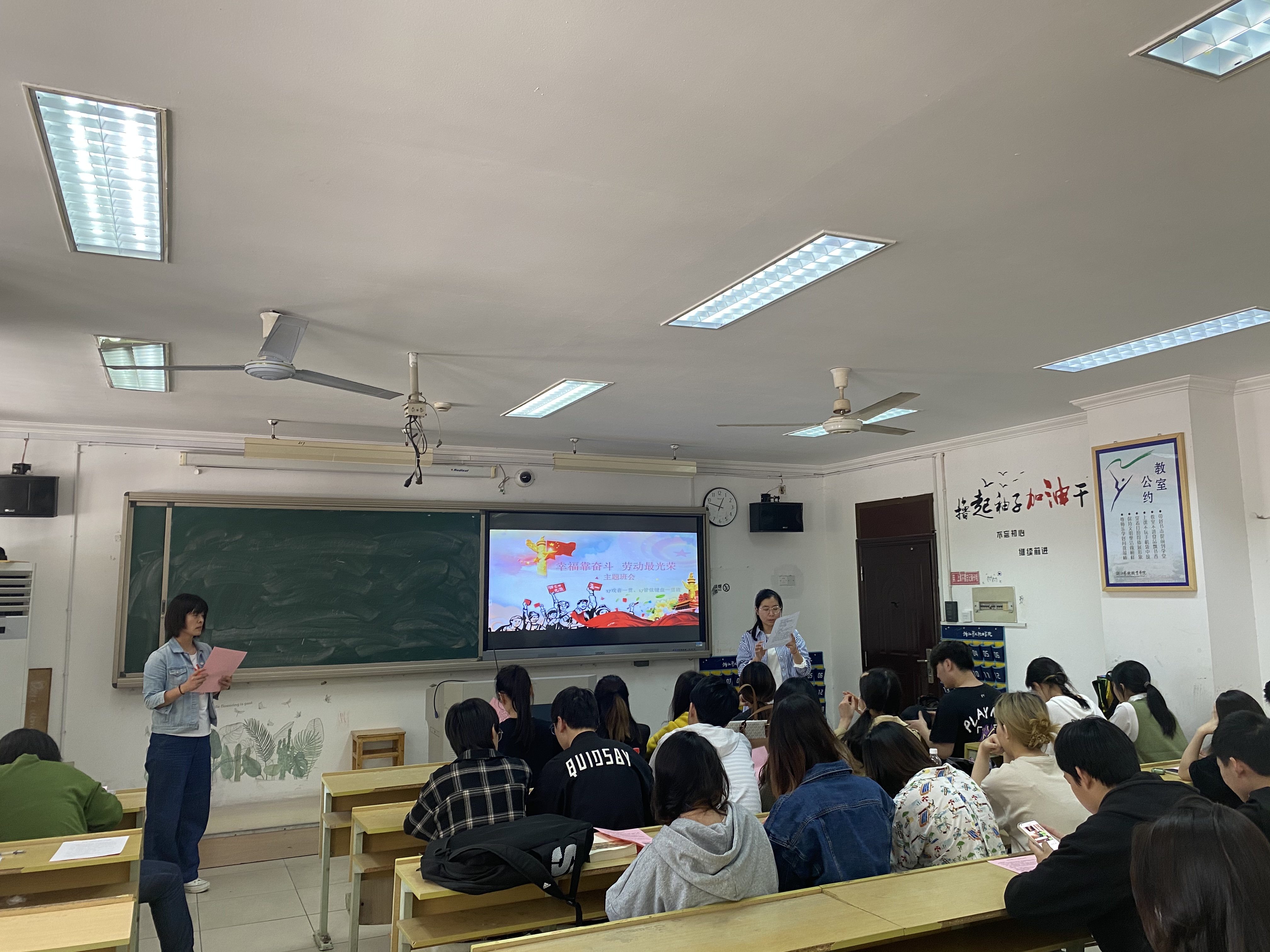 幸福靠奋斗,劳动最光荣。通过主题班会的召开,在学生中形成共识,共同营造热爱劳动、尊崇劳动的教育氛围。通过劳动教育,帮助同学学会建设世界,塑造自己,实现树德、增智、强体、育美的目的,以优异成绩向建党百年献礼。