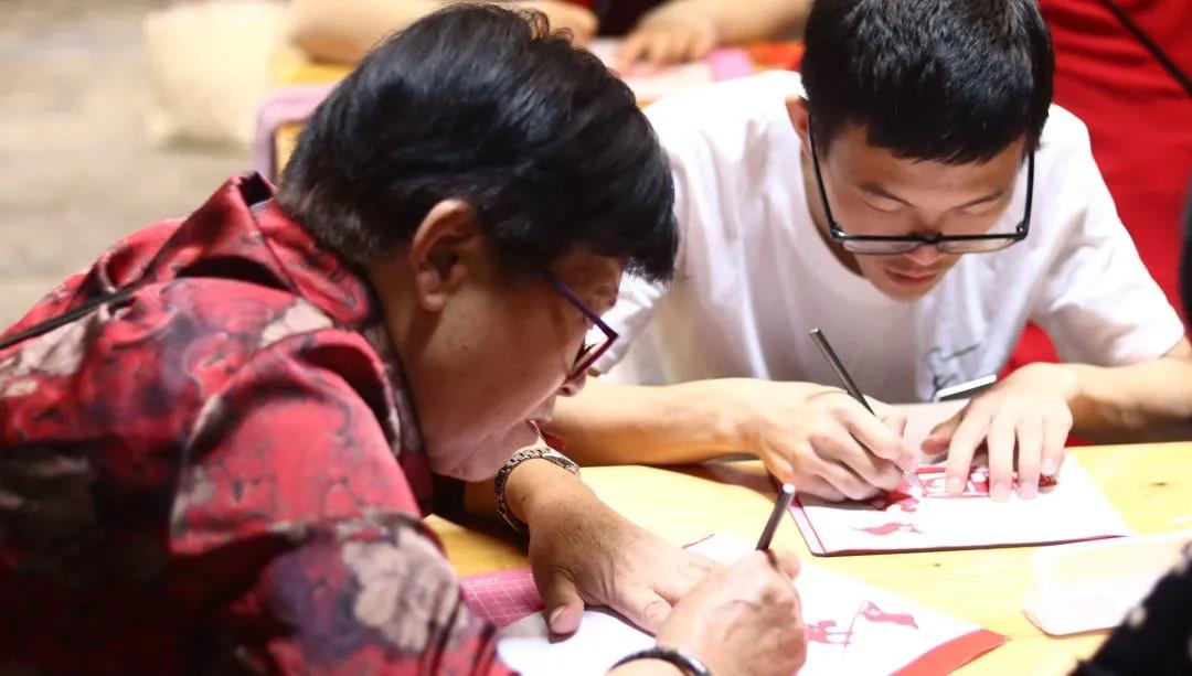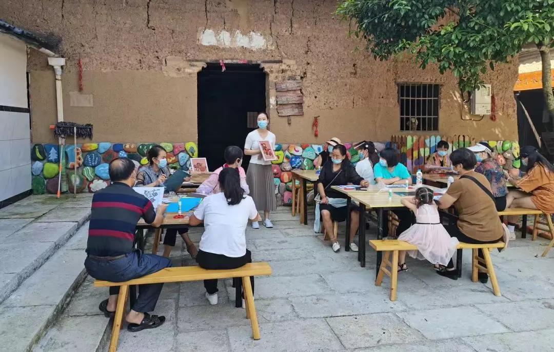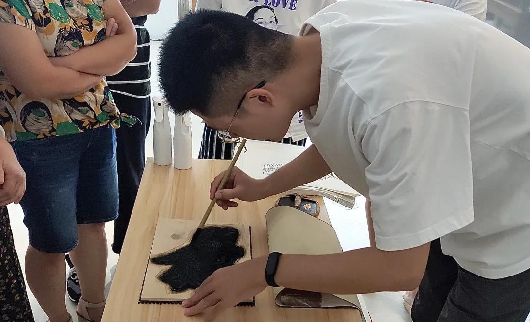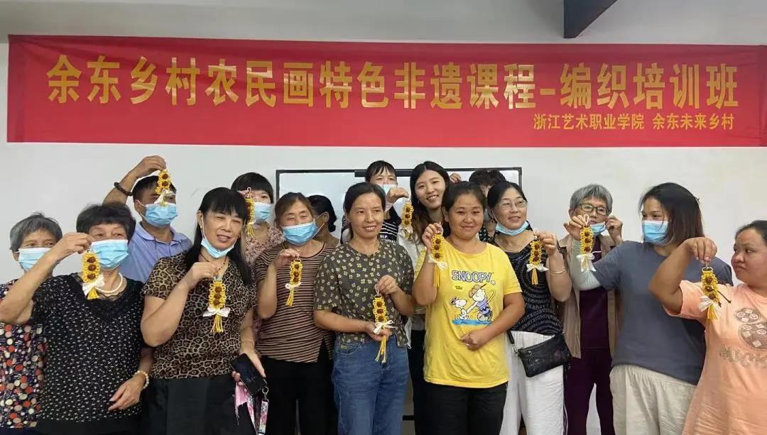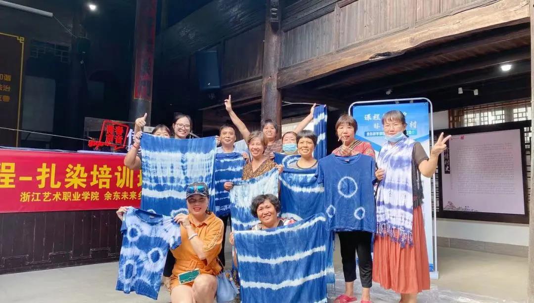 负责和余东村对接的是浙艺课程研发团队。团队针对余东村农民画的资源禀赋,带队教师和同学们深入村民创作现场,和村民们展开多次面对面研讨,最终研发了木刻版画、扎染、剪纸、编织等农民画特色非遗研学课程,既为余东的农民画添上了非遗技艺的新元素,也为余东乡村旅游带来了研学新项目。