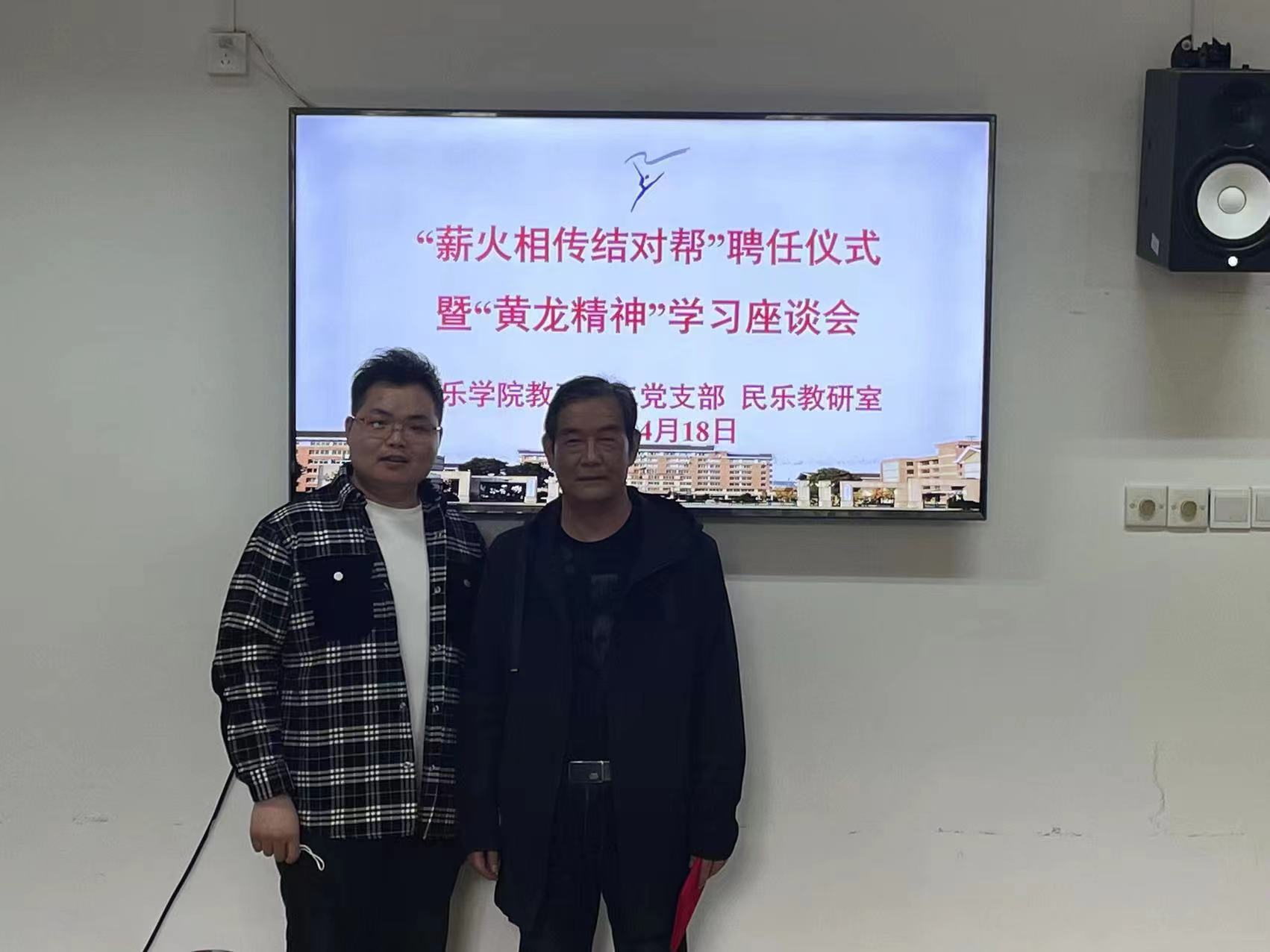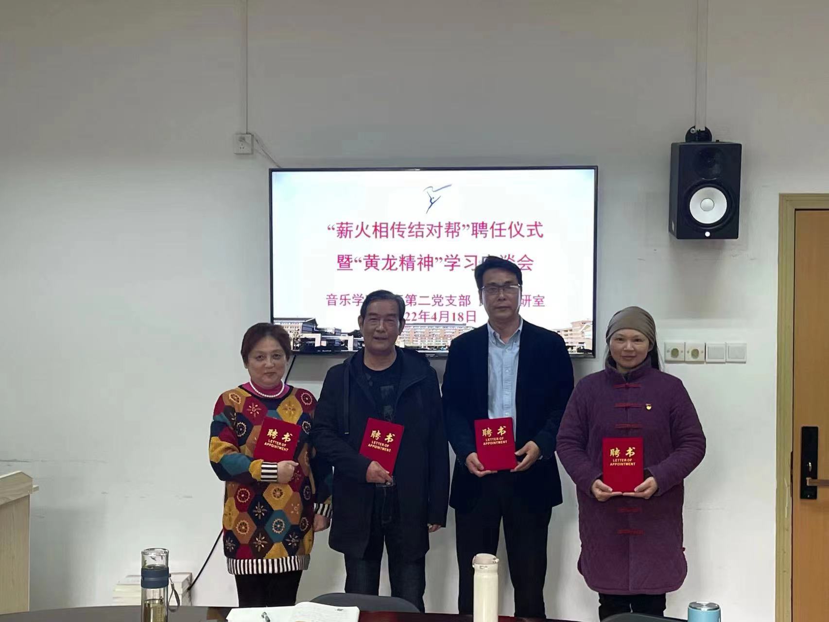 4月18日,音乐学院教工第二党支部、民乐教研室在3101党员之家举行“薪火相传结对帮”聘任仪式暨“黄龙精神”交流分享。吴樟华、朱学富、陆曙鸣、马崊等4位正高职称党员教师受聘结对4名青年教师,并作“黄龙精神”与教书育人心得分享。支部党员、民乐教研室全体教师参加。