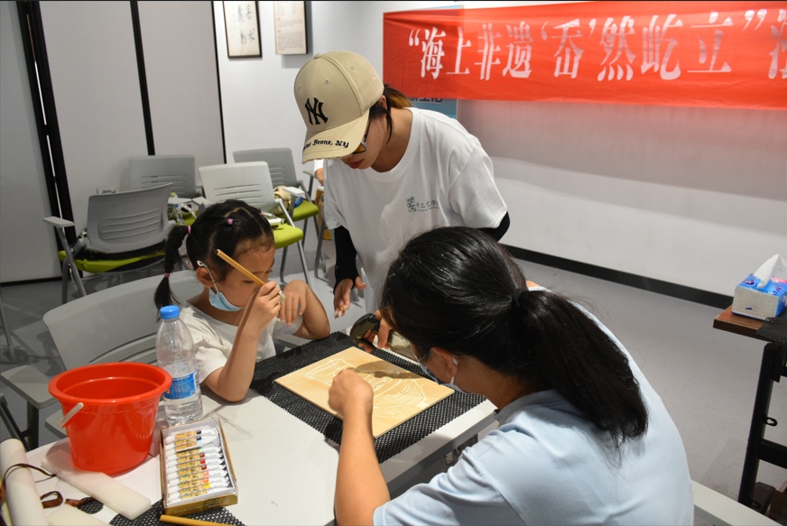 木刻韶年,水印芳华。手工艺学子现场示范绘、刻、印等一系列制作流程,将宣纸、木板和颜料巧妙融合,一幅幅精美的水印木刻版画跃然纸上,让孩子们连连感叹水印木刻的神奇。