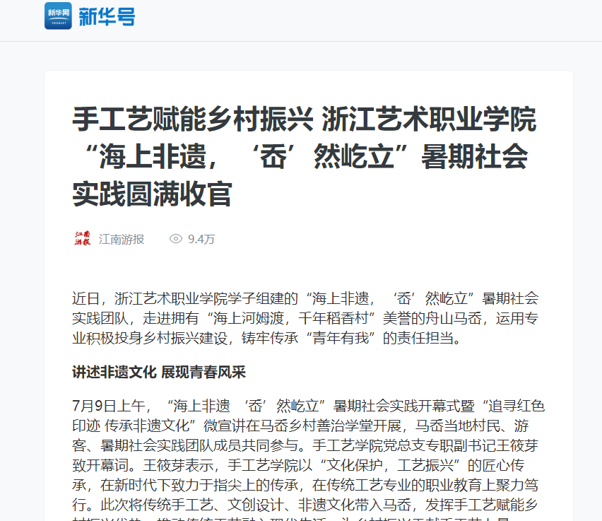 手工艺学子坚定传承非遗、服务社会初心,结合舟山马岙美丽自然风光、深厚历史底蕴,发挥非遗传播保护和文旅产业振兴双重作用。“海上非遗 ‘岙’然屹立”暑期社会实践实地活动暂告一段落,未来,将继续植根马岙非遗文化,融合创新元素深入开展IP形象、衍生拓展应用设计以及研学路线设计,打造舟山马岙的“独家记忆点”,用手工艺赋能乡村振兴,勇做共富和现代化的先行者!