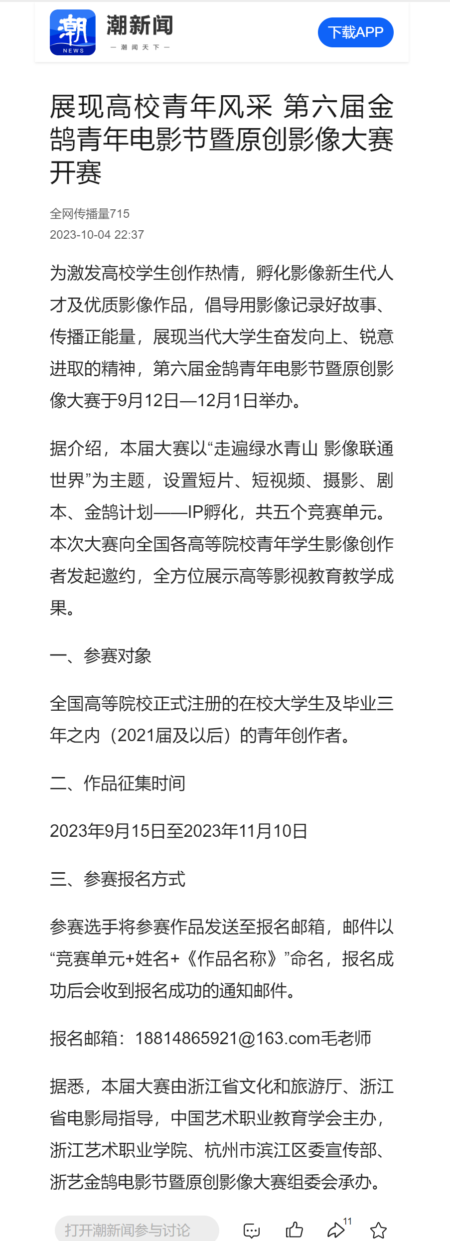 潮新闻:展现高校青年风采 第六届金鹄青年电影节暨原创影像大赛开赛