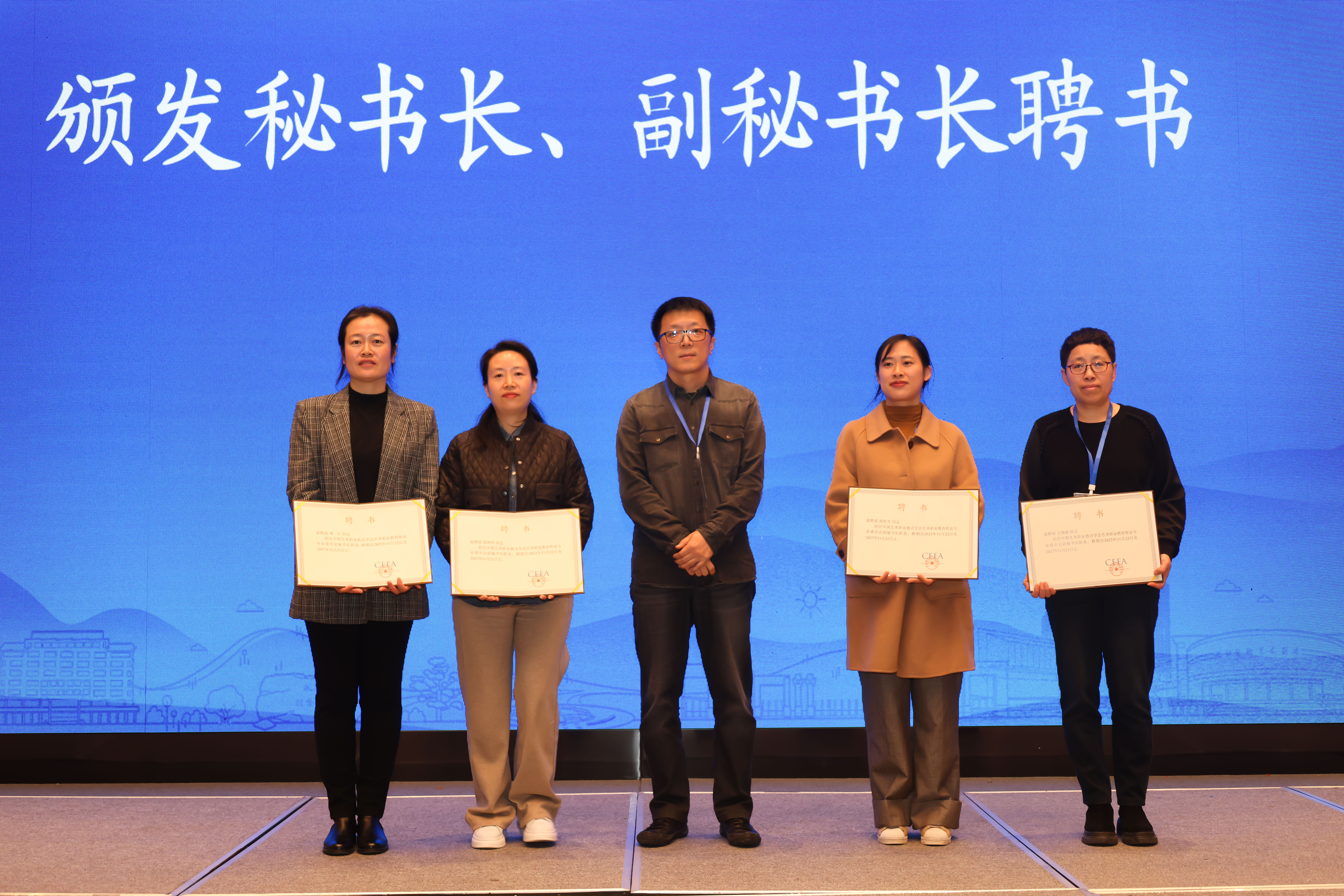 会议还正式宣布了审议通过的新一届艺术职业教育理论专业委员会、戏剧与影视专业委员会主任委员、副主任委员、秘书长及副秘书长名单,并颁发了聘书。