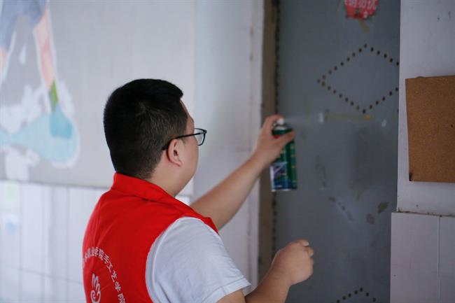 发现门上不够美观的寝室名单,有志愿者主动上前帮忙写下整洁的新名单。虽然大家双手沾满灰尘,但看到整洁如新的寝室门,每个人脸上都洋溢着明媚的笑容。
