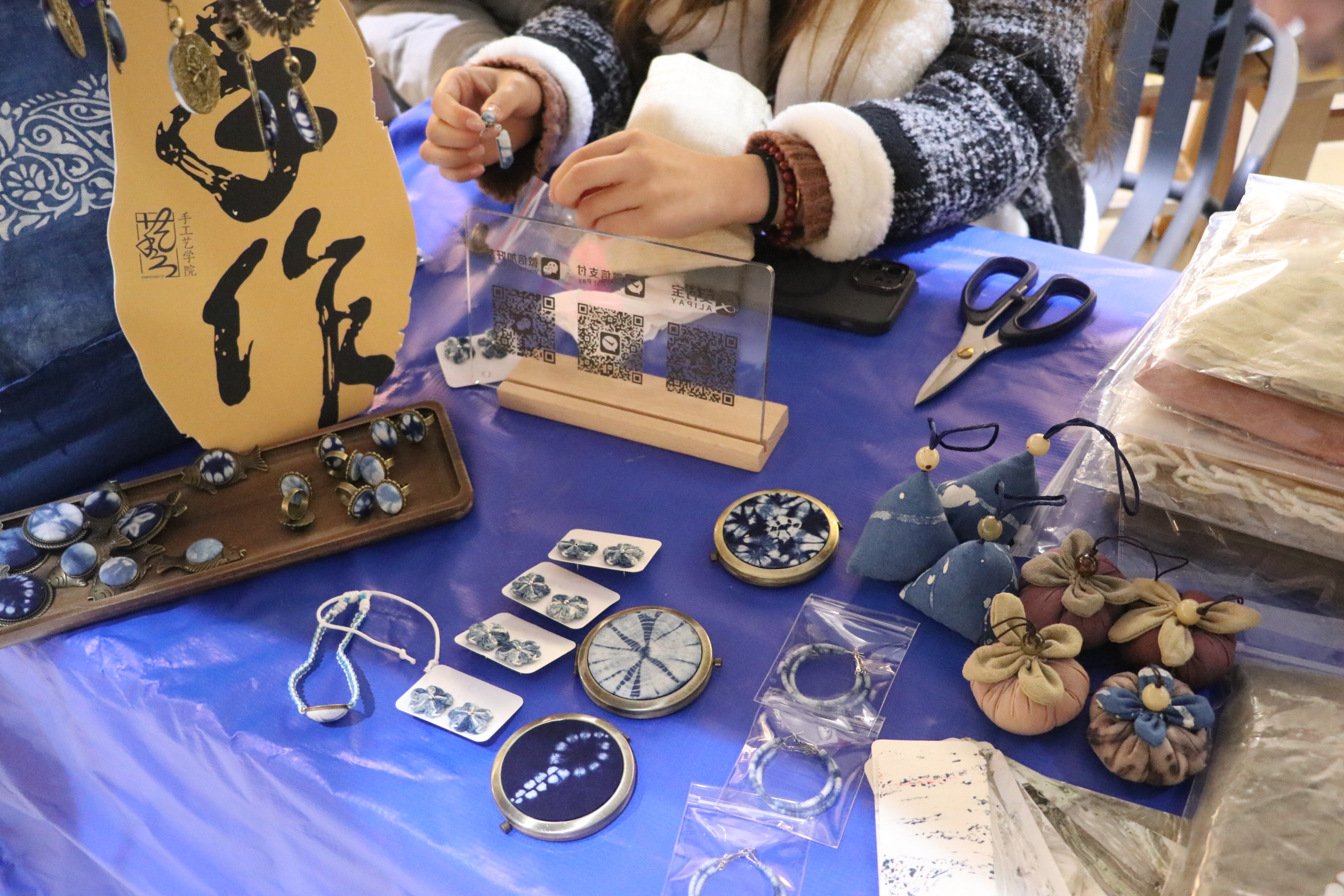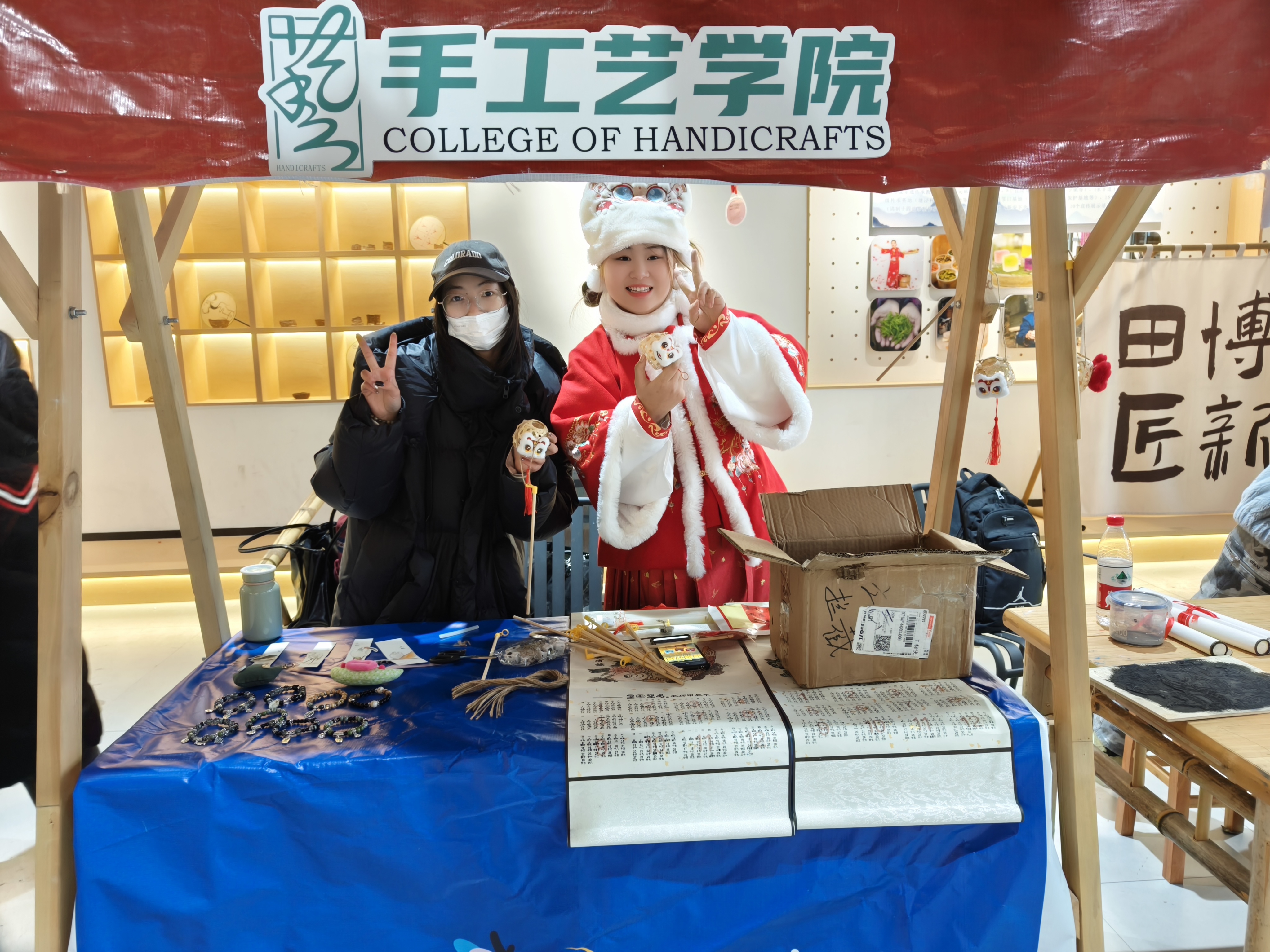 活动当天,赏灯游园会区域,在手工艺学院学生们的摊位上,用草木染制作的围巾、饰品、蓝染年历、水印木刻挂历、竹编花灯、青瓷花口杯、手工手链、挂饰、书签……传统手工艺品琳琅满目,引得游客纷纷驻足。学生利用自身所学知识,在传统技艺的基础上融合新春、元宵的元素,充分推广传统手工艺的独特魅力,通过静态展陈和动态展演让古老手工艺焕发出新的生机,让游客近距离感受到非遗之美,体会别样的年味。
