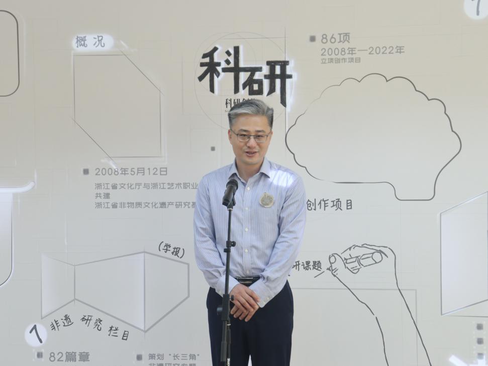 薛亮致辞。他指出,浙江非遗传习院、非遗创意产业学院自成立以来,沿着五年建设发展规划稳步前进,在非遗领域深耕传承和创新,致力于非遗保护传承、教学科研和产教融合,希望通过师生的共同努力,传承好宝贵的非遗知识,让灿烂的传统文化在新时代绽放出新光彩。他对本次展览的举办表示祝贺,并期待更多优秀的非物质文化遗产展览在浙艺展出,向全社会传播和展示具有悠久历史和时代魅力的优秀传统文化。