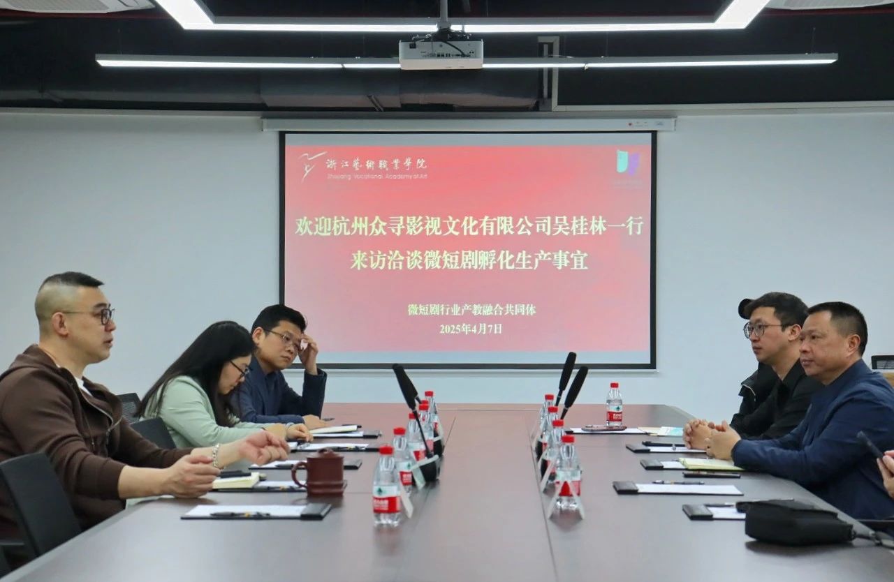 近日,戏剧影视学院召开校企合作研讨会,围绕公安题材微短剧创作及产教融合项目展开深入交流,旨在整合资源、打造微短剧精品内容,推动影视人才培养与市场需求对接。杭州众寻影视文化有限公司董事长吴桂林、总经理项渊博,全国公安文联影视委员会、杭州市警察协会副秘书长王玺,一级导演张建成,我校科研创作处(学报编辑部)副处长王玲瑛,戏剧影视学院院长那刚、党总支书记许瑛、创作中心常务副主任汤海滨参加会议。