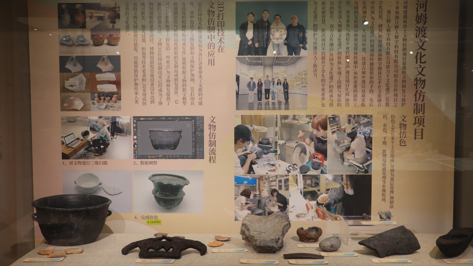 本届展览以“艺起传承”为主题,展示2025届手工艺学子在文物修复与保护、民族传统技艺、文化创意与策划、展示艺术设计四个专业的教学成果作品,书画装裱、古籍修复、陶瓷修复、古书画仿制、青瓷烧造、传统印染、水印木刻、刺绣工艺、博物插画、文创产品设计等多元艺术形式呈现。